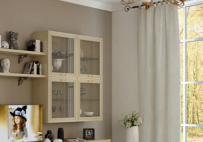 Модульная система позволит регулярно менять внешний вид гостиной по своему усмотрению. В комплект входит два навесных шкафа-витрины, напольные шкафы с застекленными вставками и глухими нижними фасадами, настенные полки и вместительная ТВ-тумба.